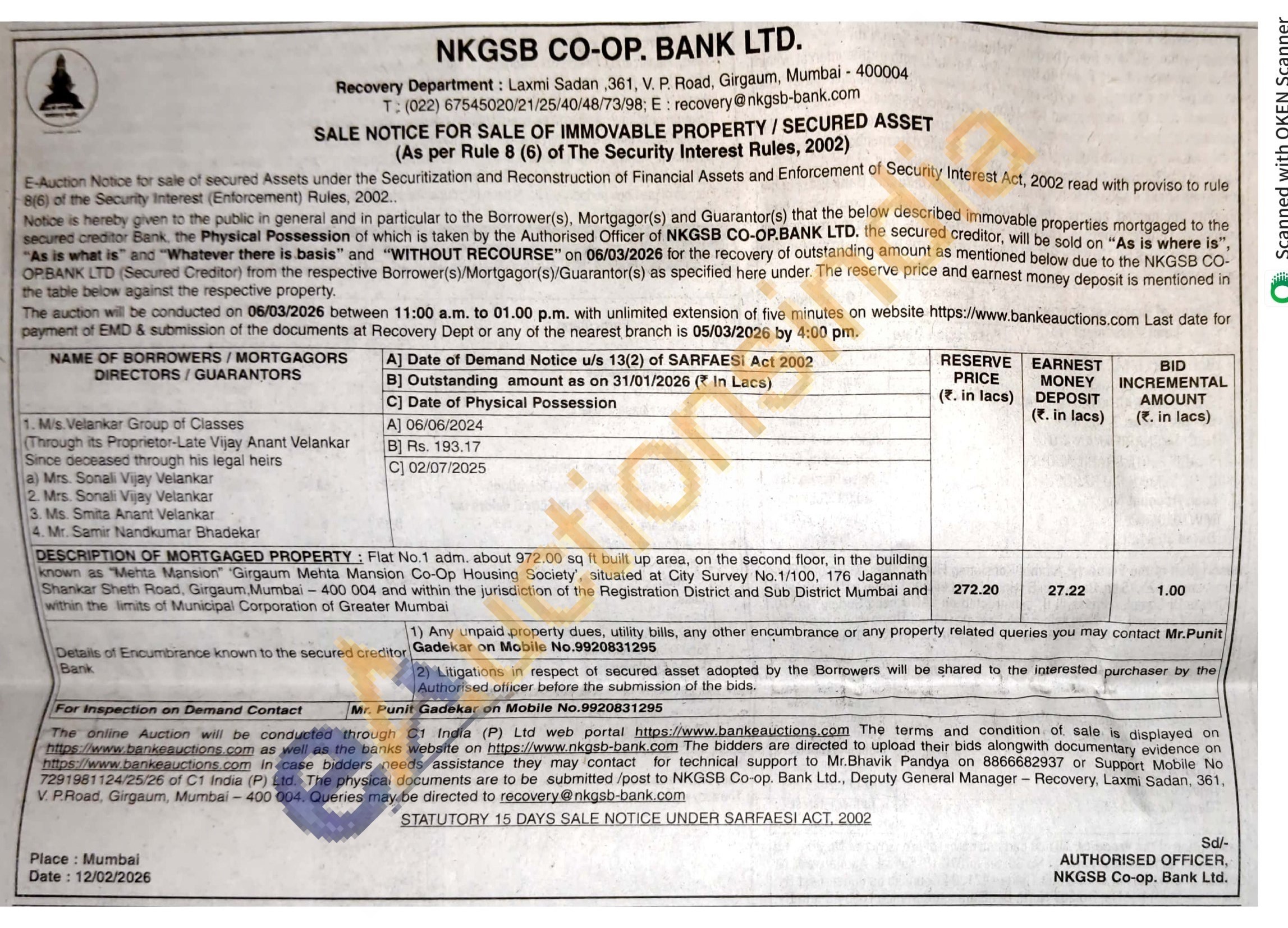 Flat No.1 adm. about 972.00 sq ft built up area, on the second floor, in the building known as "Mehta Mansion 'Girgaum Mehta Mansion Co-Op Housing Society', situated at City Survey No. 1/100, 176 Jagannath Shankar Sheth Road, Girgaum, Mumbai-400 004 and within the jurisdiction of the Registration District and Sub District Mumbai and within the limits of Municipal Corporation of Greater Mumbai