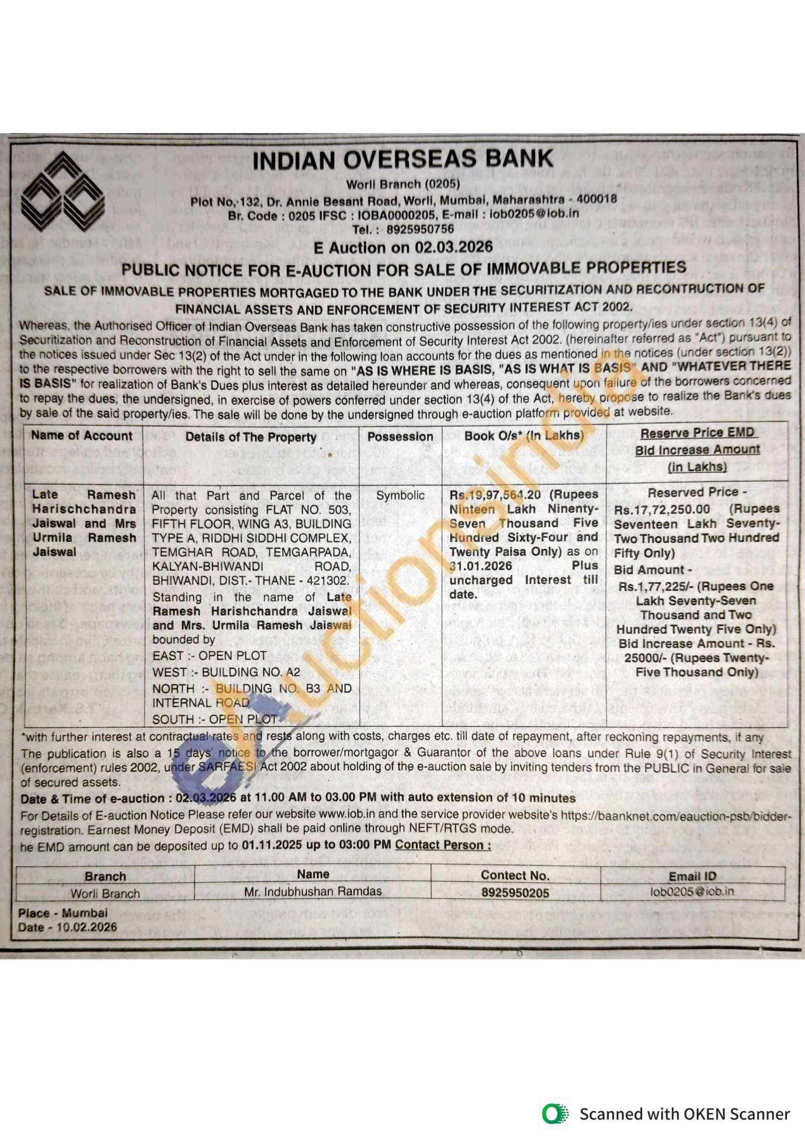 All that Part and Parcel of the Property consisting FLAT NO. 503, FIFTH FLOOR, WING A3, BUILDING TYPE A, RIDDHI SIDDHI COMPLEX, TEMGHAR ROAD, TEMGARPADA, KALYAN-BHIWANDI ROAD, BHIWANDI, DIST. THANE-421302. Standing in the name of Late Ramesh Harishchandra Jaiswal and Mrs. Urmila Ramesh Jaiswal bounded by EAST OPEN PLOT WEST BUILDING NO. A2 NORTH BUILDING NO. B3 AND INTERNAL ROAD SOUTH OPEN PLOT