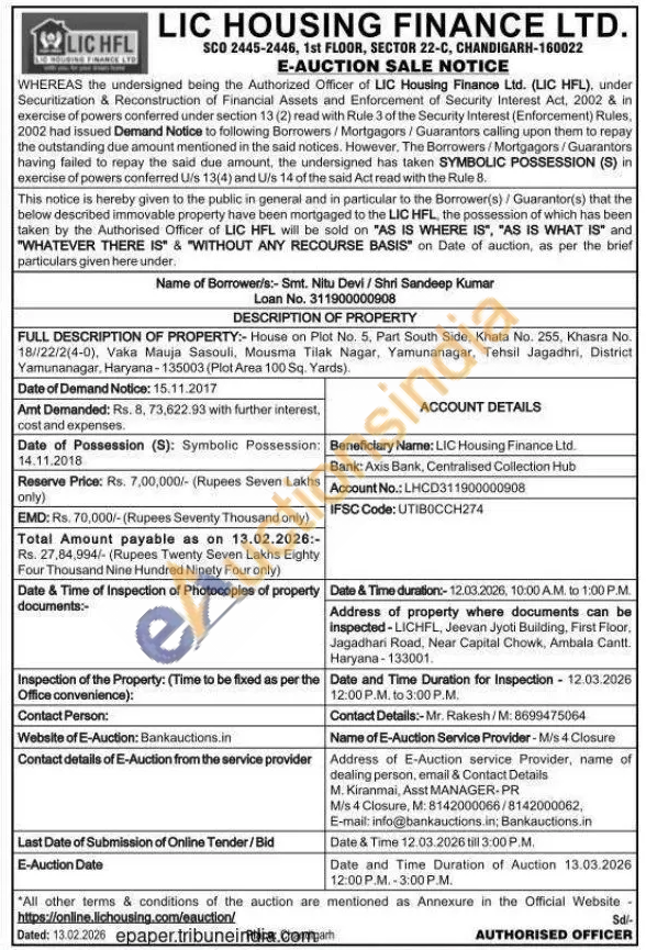 FULL DESCRIPTION OF PROPERTY:- House on Plot No. 5, Part South Side, Khata No. 255, Khasra No.18//22/2(4-0), Vaka Mauja Sasouli, Mousma Tilak Nagar, Yamunanagar, Tehsil Jagadhri, District Yamunanagar, Haryana-135003 (Plot Area 100 Sq. Yards)
