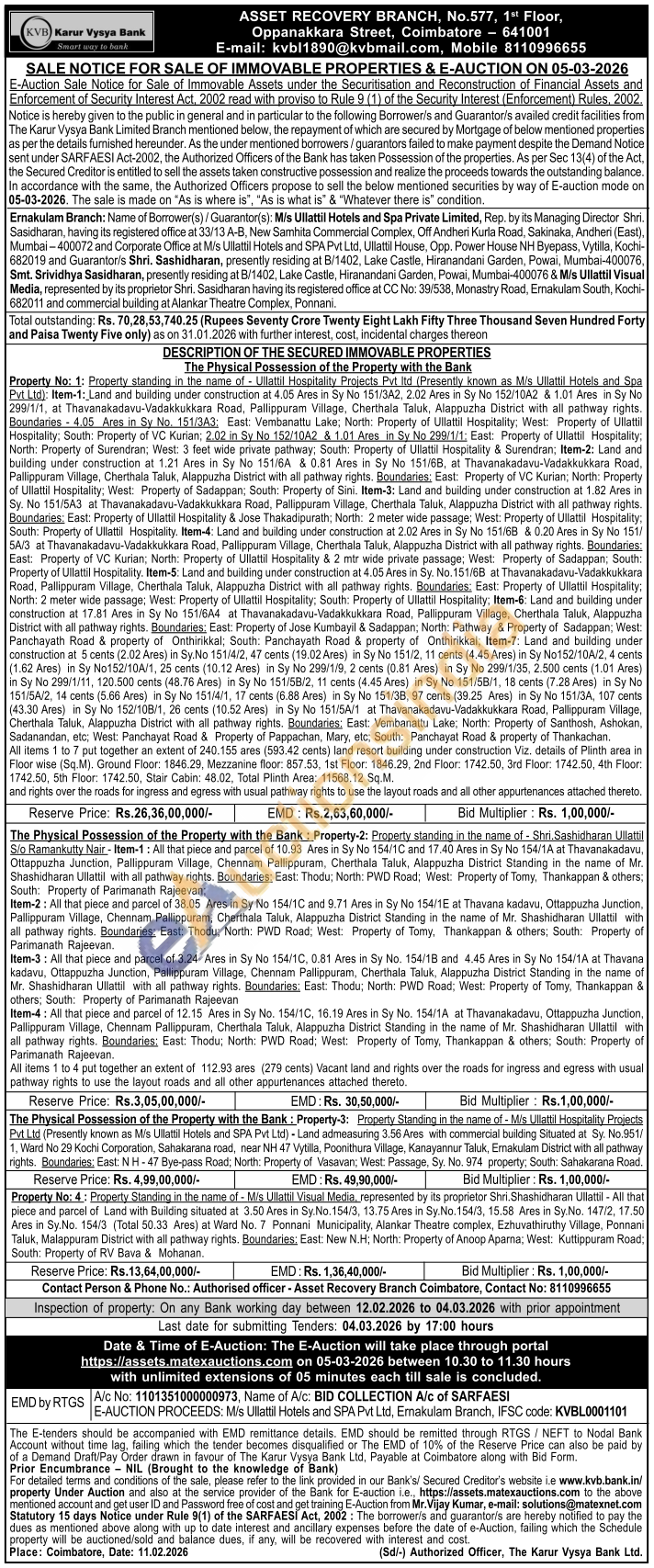 The Physical Possession of the Property with the Bank: Property-3: Property Standing in the name of - M/s Ullattil Hospitality Projects Pvt Ltd (Presently known as M/s Ullattil Hotels and SPA Pvt Ltd) - Land admeasuring 3.56 Ares with commercial building Situated at Sy. No.951/1, Ward No 29 Kochi Corporation, Sahakarana road, near NH 47 Vytilla, Poonithura Village, Kanayannur Taluk, Ernakulam District with all pathway