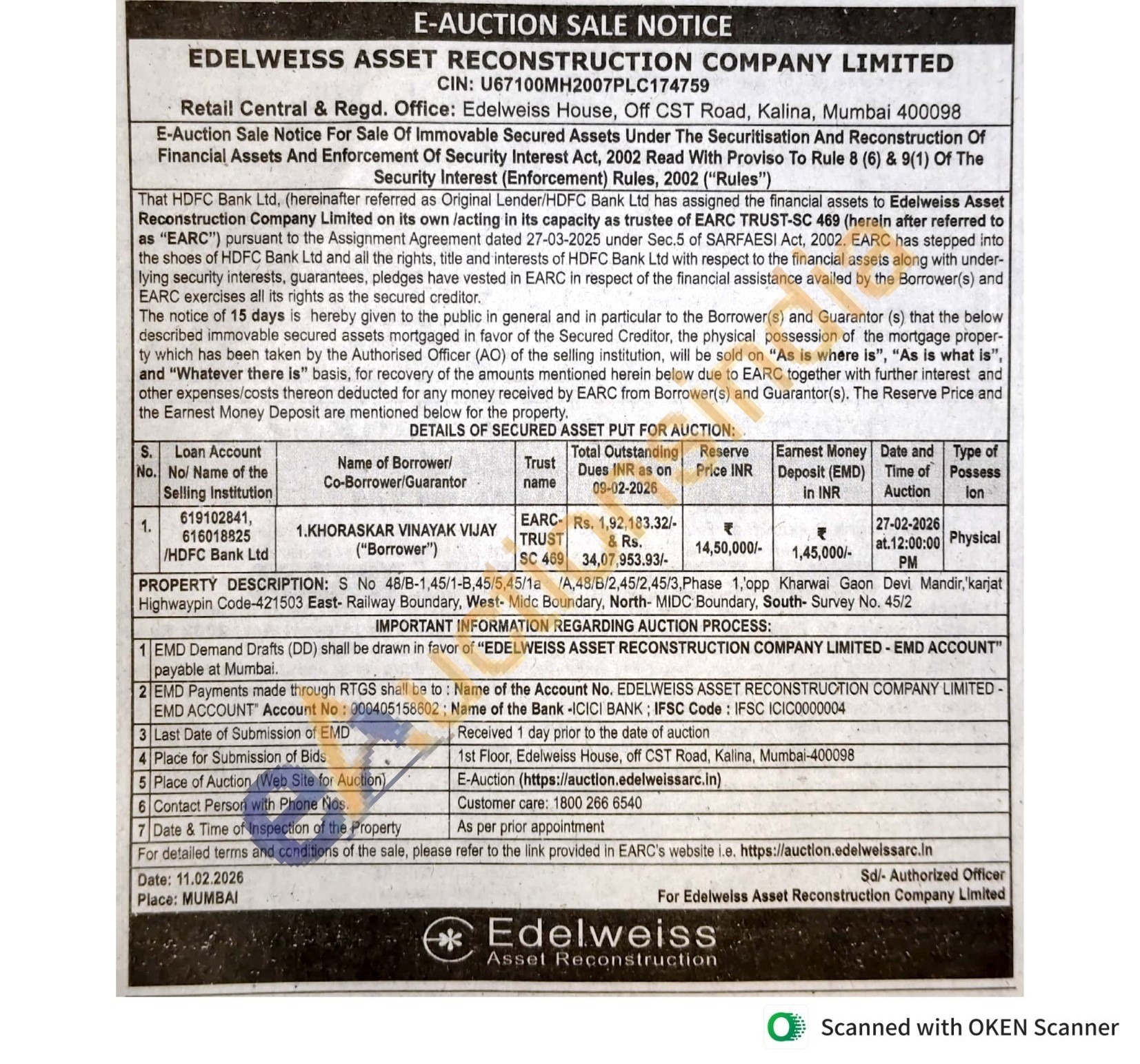 S No 48/B-1,45/1-B,45/5,45/1a /A,48/B/2,45/2,45/3, Phase 1,'opp Kharwai Gaon Devi Mandir, karjat Highwaypin Code-421503 East- Railway Boundary, West- Midc Boundary, North- MIDC Boundary, South- Survey No. 45/2