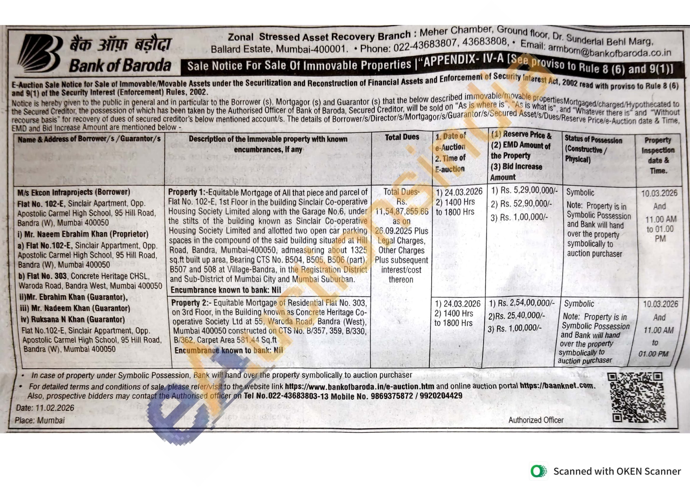Property 2:- Equitable Mortgage of Residential Flat No. 303, on 3rd Floor, in the Building known as Concrete Heritage Co-operative Society Ltd at 55, Waroda Road, Bandra (West), Mumbai 400050 constructed on CTS No. B/357, 359, B/330, B/362, Carpet Area 581.44 Sq.ft Encumbrance known to bank: Nil