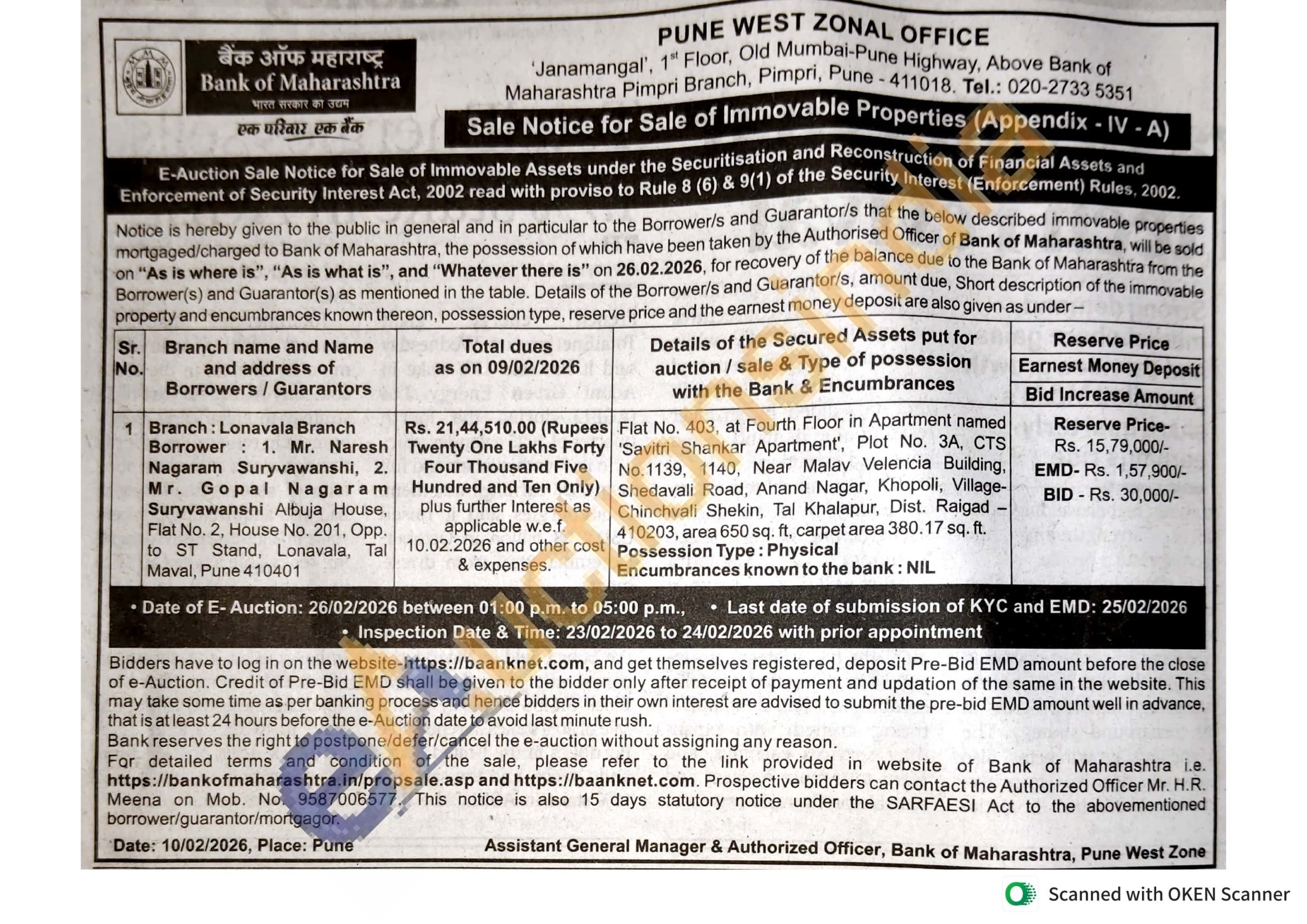 Flat No. 403, at Fourth Floor in Apartment named 'Savitri Shankar Apartment', Plot No. 3A, CTS No.1139, 1140, Near Malav Velencia Building, Shedavali Road, Anand Nagar, Khopoli, Village-Chinchvali Shekin, Tal Khalapur, Dist. Raigad 410203, area 650 sq. ft, carpet area 380.17 sq. ft. Encumbrances known to the bank: NIL Possession Type: Physical