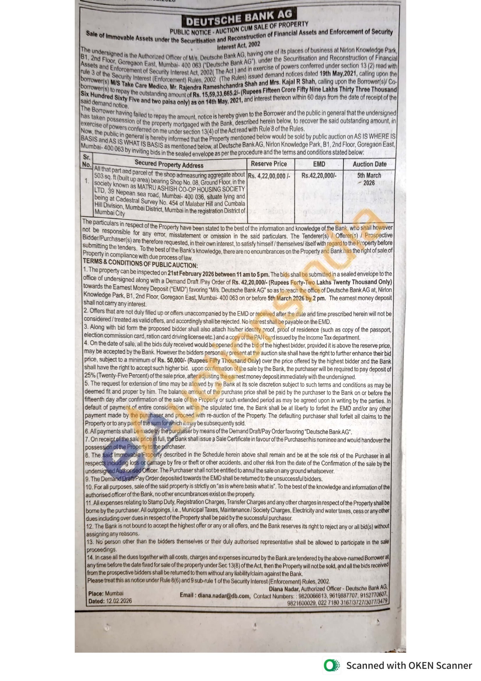 All that part and parcel of the shop admeasuring aggregate about 503 sq. ft (built up area) bearing Shop No. 08, Ground Floor, in the society known as MATRU ASHISH CO-OP HOUSING SOCIETY LTD, 39 Nepean sea road, Mumbai- 400 036, situate lying and being at Cadestral Survey No. 454 of Malabar Hill and Cumbala Hill Division, Mumbai District, Mumbai in the registration District of Mumbai City