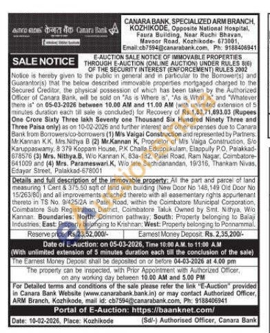 Details and full description of the immovable property: All the part and parcel of land measuring 1 Cent & 375.50 sqft of land with building (New Door No 148, 149 Old Door No 15/263/80) and all improvements attached thereto with all easementary rights appurtenant therato in TS No. 9/425/2A in Patel Road, within the Coimbatore Municipal Corporation. Coimbatore Sub Registration District, Coimbatore Taluk Owned by Smt. Nithya, Wio Kannan. Boundaries: North: Common pathway, South: Property belonging to Balaji Industries, East: Properly belonging to Krishnan: West: Property belonging to Ponnammal