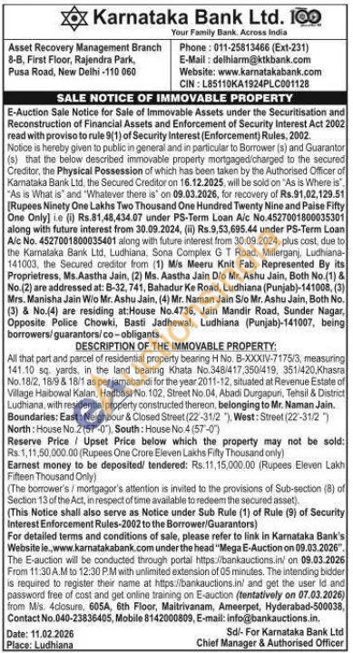 DESCRIPTION OF THE IMMOVABLE PROPERTY: All that part and parcel of residential property bearing H No. B-XXXIV-7175/3, measuring 141.10 sq yards, in the land bearing Khata No.348/417,350/419, 351/420, Khasra No. 18/2, 18/98 18/1 as per jamabandi for the year 2011-12, situated at Revenue Estate of Village Haibowal Kalan, Hadbast No 102, Street No. 04, Abadi Durgapun, Tehsil & District Ludhiana, with residential property constructed thereon, belonging to Mr. Naman Jain. Boundaries: East: Neighbour & Closed Street (22-31/2"), West: Street (22-31/2") North: House No.2 (57-0"), South: House No 4 (57-07)