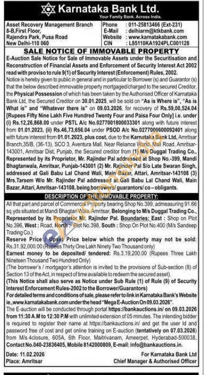 DESCRIPTION OF THE IMMOVABLE PROPERTY: All that part and parcel of Commercial Property bearing Shop No.399, admeasuring 91.66 sq. yds situated at Mandi Bhagtan Wala, Amritsar, Belonging to Mis Duggal Trading Co., Represented by its Proprietor Mr. Rajinder Pal. Boundaries: East: Shop on Plot No.396, West: Road, North: Plot No.398, South: Shop On Plot No.400 (M/s Sandeep Trading Co.)