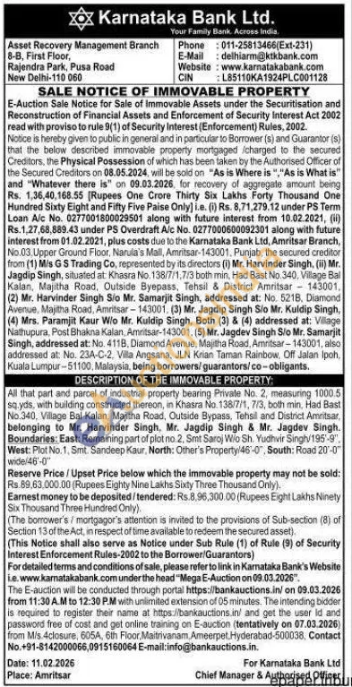 DESCRIPTION OF THE IMMOVABLE PROPERTY: All that part and parcel of industrial property bearing Private No. 2, measuring 1000.5 sq.yds, with building constructed thereon, in Khasra No. 138/7/1, 7/3, both min, Had Bast No.340, Village Bal Kalan, Majitha Road, Outside Bypass, Tehsil and District Amritsar, belonging to Mr. Harvinder Singh, Mr. Jagdip Singh & Mr. Jagdev Singh. Boundaries: East: Remaining part of plot no.2. Smt Saroj Wo Sh. Yudhvir Singh/195-9", West: Plot No.1, Smt. Sandeep Kaur, North: Other's Property/46-0, South: Road 20-0" wide/46-0"