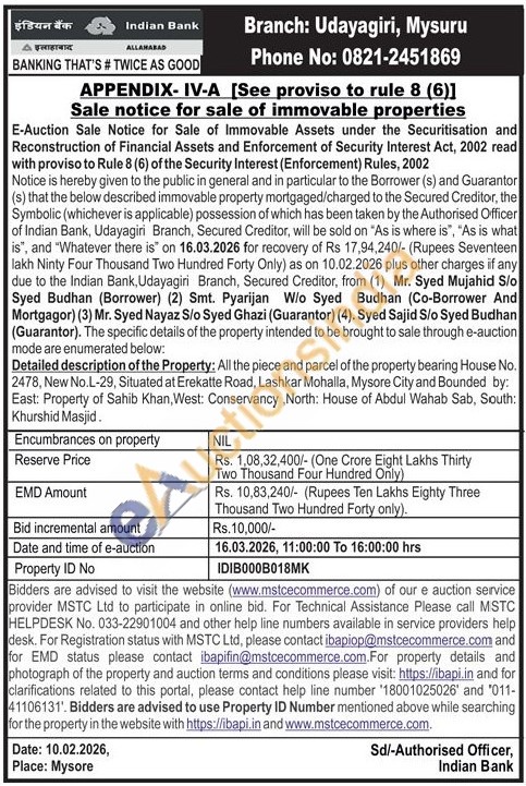 Detailed description of the Property: All the piece and parcel of the property bearing House No. 2478, New No.L-29, Situated at Erekatte Road, Lashkar Mohalla, Mysore City and Bounded by: East: Property of Sahib Khan, West: Conservancy, North: House of Abdul Wahab Sab, South: Khurshid Masjid