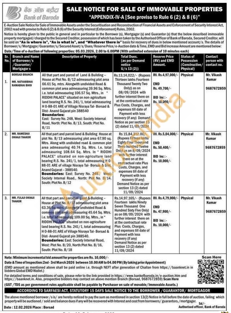 All that part and parcel of Land & Building -House at Plot No. B/17 admeasuring plot area 63.36 Sq. mtrs. Alongwith undivided Road & common plot area admeasuring 45.64 Sq. Mtrs. i.e. total admeasuring 109.00 Sq. Mtrs., in RIDDHI PALACE" situated on non-agriculture land bearing R.S. No. 241/1, total admeasuring H0-88-01 ARE of Village Nisraya Tal-Borsad & Dist- Anand Gujarat pin 388540. Boundaries: East: Society Internal Road, West: Plot No. B/20, North: Plot No. B/16, South: Plot No. B/18