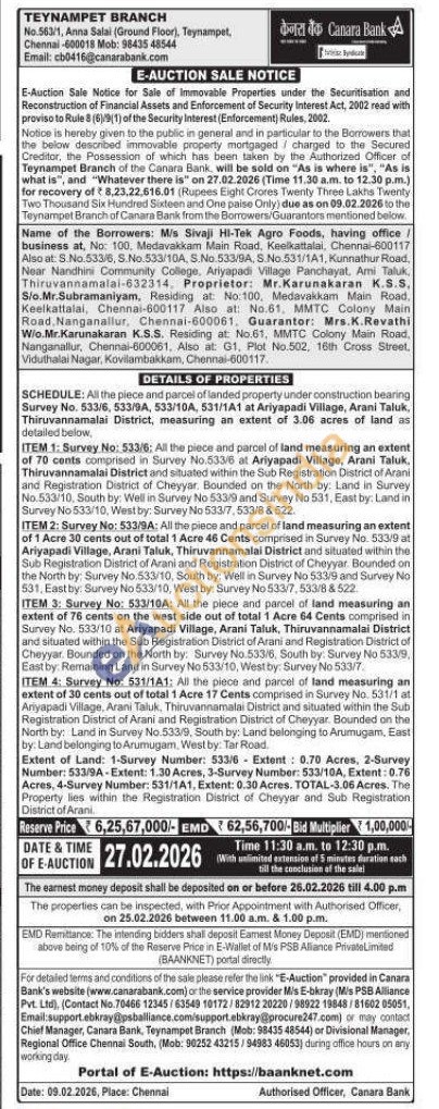 All the piece and parcel of landed property under construction bearing Survey No. 533/6, 533/94, 533/10A, 531/1A1 at Ariyapadi Village, Arani Taluk, Thiruvannamalai District, measuring an extent of 3.06 acres of land as detailed below, ITEM 1: Survey No: 533/6; All the piece and parcel of land measuring an extent of 70 cents comprised in Survey No.533/6 at Ariyapadi Village, Arani Taluk, Thiruvannamalai District and situated within the Sub Registration District of Arani and Registration District of Cheyyar. Bounded on the North by: Land in Survey No.533/10, South by: Well in Survey No 533/59 and Survey No 531, East by: Land in Survey No 533/10, West by: Survey No 533/7, 533/8 & 522. ITEM 2: Survey No: 533/9A: All the piece and parcel of land measuring an extent of 1 Acre 30 cents out of total 1 Acre 46 Cents comprised in Survey No. 533/9 at Ariyapadi Village, Arani Taluk, Thiruvannamalai District and situated within the Sub Registration District of Arani and Registration District of Cheyyar. Bounded on the North by: Survey No. 533/10, South by: Well in Survey No 533/9 and Survey No 531, East by: Survey No 533/10, West by: Survey No 533/7, 533/8 & 522. ITEM 3: Survey No: 533/10A: All the piece and parcel of land measuring an extent of 76 cents on the west side out of total 1 Acre 64 Cents comprised in Survey No. 533/10 at Ariyapadi Village, Arani Taluk, Thiruvannamalai District and situated within the Sub Registration District of Arani and Registration District of Cheyyar. Bounded on the North by: Survey No.533/6, South by. Survey No 533/9, East by: Remaining Land in Survey No 633/10, West by: Survey No 533/7 ITEM 4: Survey No: 531/1A1: All the piece and parcel of land measuring an extent of 30 cents out of total 1 Acre 17 Cents comprised in Survey No. 531/1 at Ariyapadi Village. Arani Taluk, Thiruvannamalai District and situated within the Sub Registration District of Arani and Registration District of Cheyyar. Bounded on the North by: Land in Survey No.533/9, South by: Land belonging to Arumugam, East by: Land belonging to Arumugam, West by: Tar Road. Extent of Land: 1-Survey Number: 533/6 Extent: 0.70 Acres, 2-Survey Number: 533/9A-Extent: 1.30 Acres, 3-Survey Number: 533/10A, Extent: 0.76 Acres, 4-Survey Number: 531/1A1, Extent: 0.30 Acres. TOTAL-3.06 Acres. The Property lies within the Registration District of Cheyyar and Sub Registration District of Arani