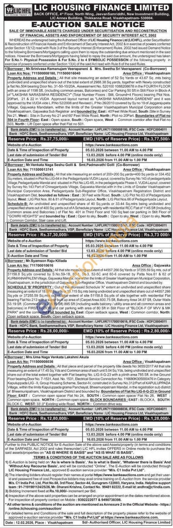 1) All that site measuring an extent of 52 Sq Yards or 43.67 Sq.mts being undivided and unspecified share out of the total extent of 2988.38 Sq yards, together with Newly constructed a flat No.504 bearing Door No. 31-50-10/20A, Assessment No. 520100 1088208678 in the FOURTH FLOOR with an area of 1198 Sft. (including common areas, Balconies) and Car Parking 50 Stt in Stilt Floor in Block-A of "LAKSHMI NARASIMHA RESIDENCY (Total Number Floors: Stilt, Ground+4 Floors) bearing Plot Nos. 20Part, 21 & 22 in VUDA Approved layout named as "LAKSHMI NARASIMHA GARDENS" and it was approved by the VUDA vide LP.No 52/2008 and Revised LP No 26/2010 covered by Sy no 19 of Jaggarajupeta Village, Gajuwaka Mandalam, within the limits of the Greater Visakhapatnam Muncipal Corporation area Visakhapatnam, Gajuwaka Sub Registrar and bounded by: East: 40'Feet Wide Road, South :Site in Survey No 21, West: Site in Survey No 21 and 60' Feet Wide Road, North: Plot no 20Part. Boundaries of Flat no 504 in Fourth Floor: East: Open space, South: Open space, West: Common corridor after that Flat no 503, North: Lift Open space after that Flat no 501.