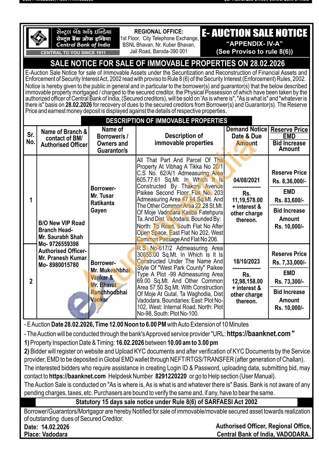 All That Part And Parcel Of The Property At Vibhag A Tikka No 20/1 C.S No. 62/A/1 Admeasuring Area 605.77.61 Sq.Mt. In Which It Is Constructed By Thakorji Avenue Paikee Second Floor Flat No. 203 Admeasuring Area 47.94 Sq.Mt. And The Other Common Area 22.28 St.Mt. Of Moje Vadodara Kasba Fatehpura Ta. And Dist. Vadodara. Bounded By: North: Tp Road, South Flat No After Open Space, East Flat No 202, West Common Passage And Flat No 206.