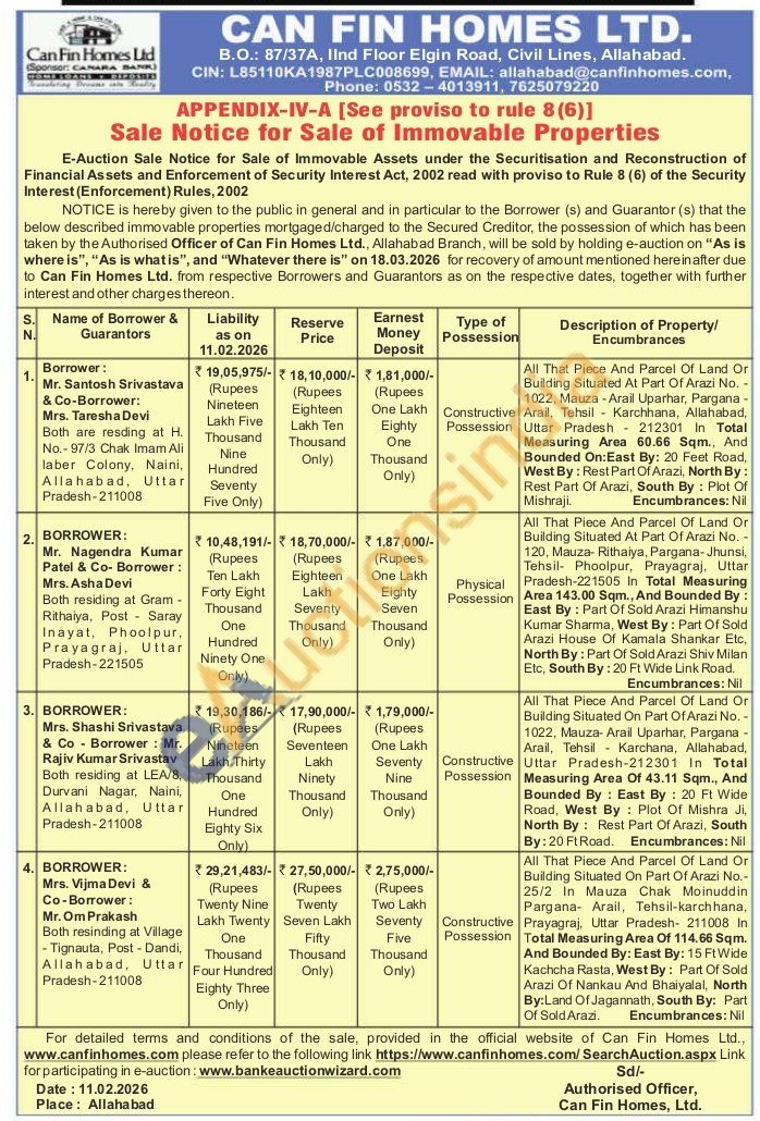 All That Piece And Parcel Of Land Or Building Situated On Part Of Arazi No.-1022, Mauza- Arail Uparhar, Pargana Arail, Tehsil Karchana, Allahabad, Uttar Pradesh-212301 In Total Measuring Area Of 43.11 Sqm., And Bounded By: East By: 20 Ft Wide Road, West By: Plot Of Mishra Ji, North By: Rest Part Of Arazi, South By: 20 Ft Road. Encumbrances: Nil