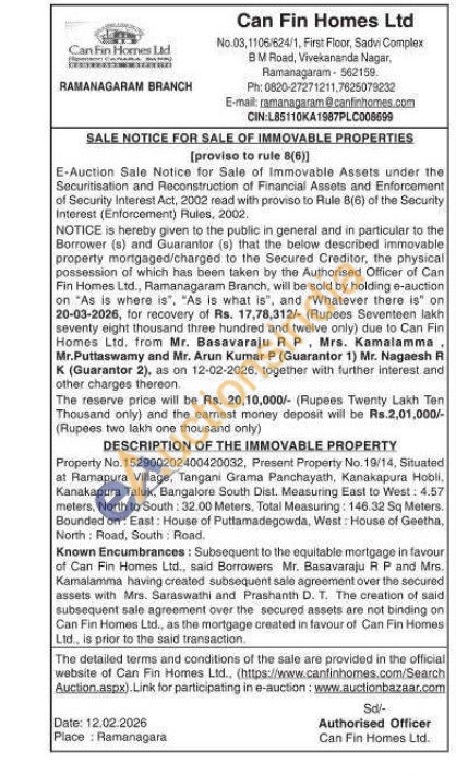 Property No. 152900202400420032, Present Property No. 19/14, Situated at Ramapura Village, Tangani Grama Panchayath, Kanakapura Hobli, Kanakapura Taluk, Bangalore South Dist. Measuring East to West: 4.57 meters, North to South: 32.00 Meters. Total Measuring: 146.32 Sq Meters. Bounded on: East: House of Puttamadegowda, West: House of Geetha, North Road, South Road.