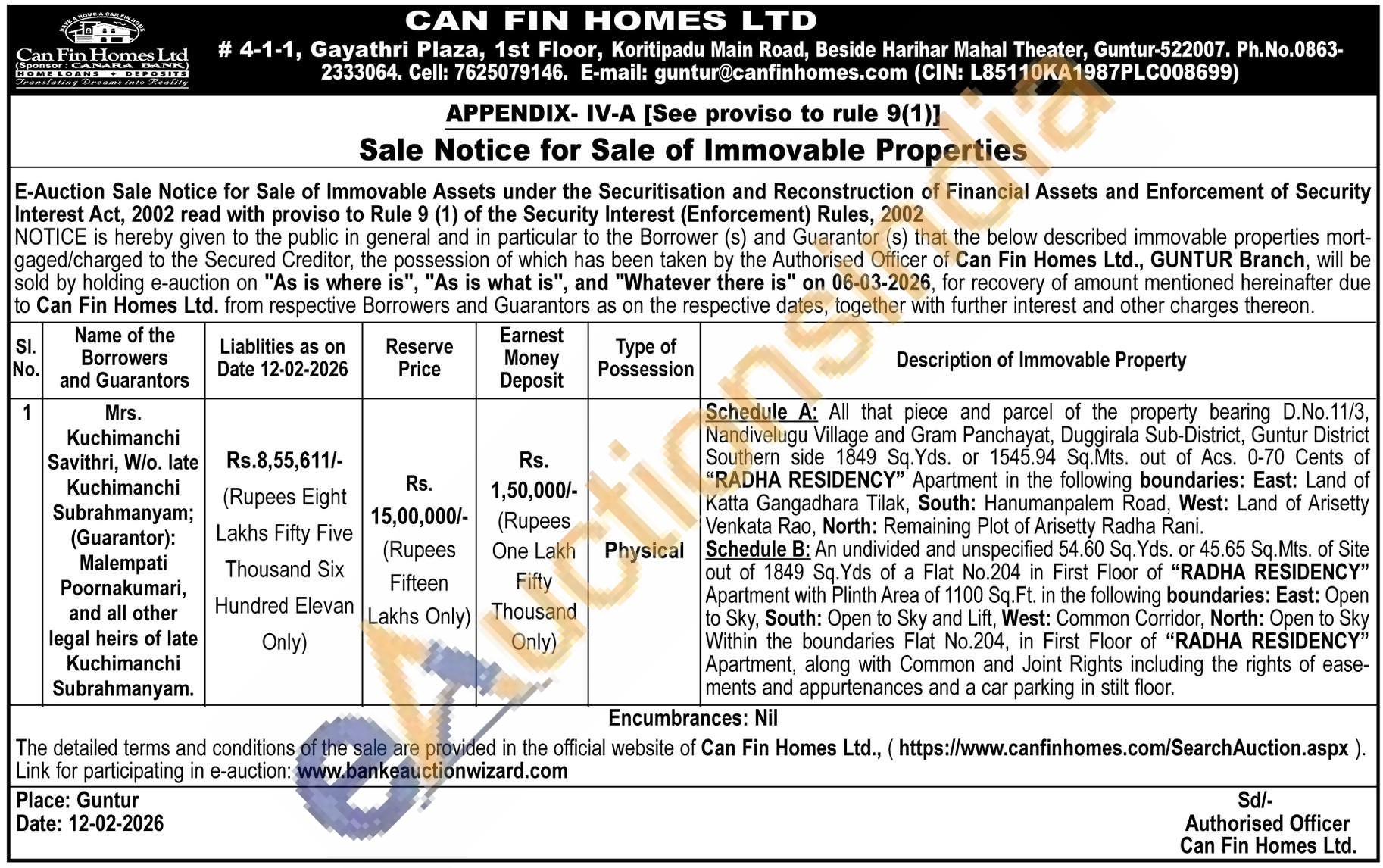 Schedule A: All that piece and parcel of the property bearing D.No.11/3, Nandivelugu Village and Gram Panchayat, Duggirala Sub-District, Guntur District Southern side 1849 Sq. Yds. or 1545.94 Sq.Mts. out of Acs. 0-70 Cents of "RADHA RESIDENCY" Apartment in the following boundaries: East: Land of Katta Gangadhara Tilak, South: Hanumanpalem Road, West: Land of Arisetty Venkata Rao, North: Remaining Plot of Arisetty Radha Rani. Schedule B: An undivided and unspecified 54.60 Sq. Yds. or 45.65 Sq.Mts. of Site out of 1849 Sq. Yds of a Flat No.204 in First Floor of "RADHA RESIDENCY" Apartment with Plinth Area of 1100 Sq.Ft. in the following boundaries: East: Open to Sky, South: Open to Sky and Lift, West: Common Corridor, North: Open to Sky Within the boundaries Flat No.204, in First Floor of "RADHA RESIDENCY" Apartment, along with Common and Joint Rights including the rights of ease-ments and appurtenances and a car parking in stilt floor.