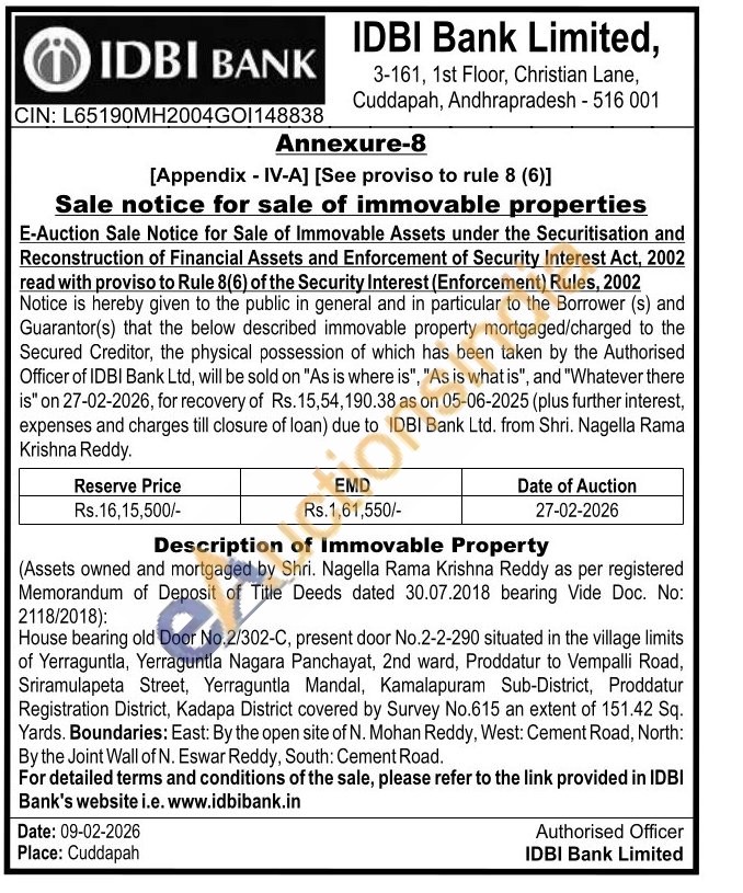 House bearing old Door No.2/302-C, present door No.2-2-290 situated in the village limits of Yerraguntla, Yerraguntla Nagara Panchayat, 2nd ward, Proddatur to Vempalli Road, Sriramulapeta Street, Yerraguntla Mandal, Kamalapuram Sub-District, Proddatur Registration District, Kadapa District covered by Survey No.615 an extent of 151.42 Sq. Yards. Boundaries: East: By the open site of N. Mohan Reddy, West: Cement Road, North: By the Joint Wall of N. Eswar Reddy, South: Cement Road