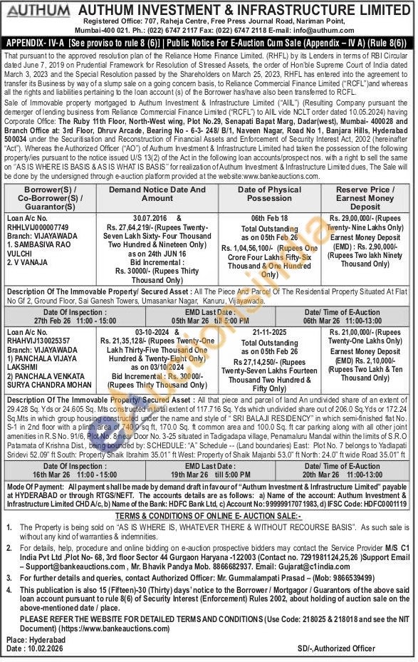 Description Of The Immovable Property/ Secured Asset: All that piece and parcel of land An undivided share of an extent of 29.428 Sq. Yds or 24.605 Sq. Mts constructed in total extent of 117.716 Sq. Yds which undivided share out of 206.0 Sq. Yds or 172.24 Sq.Mts in which group housing constructed under the name and style of SRI BALAJI RESIDENCY" in which semi-finished flat No. S-1 in 2nd floor with a plinth area of 740.0 sq ft, 170.0 Sq. ft common area and 100.0 Sq. ft car parking along with all other joint amenities in R.S No. 91/6, Plot No. 8 near Door No. 3-25 situated in Tadigadapa village, Penamaluru Mandal within the limits of S.R.O Patamata of Krishna Dist, being bounded by: SCHEDULE: "A" Schedule (Land boundaries) East: Plot No. 7 belongs to Yadlapati Sridevi 52.09" ft South: Property Shaik Ibrahim 35.01 ft West: Property of Shaik Majanbi 53.0" ft North: 24.0 ft wide Road 35.01" ft