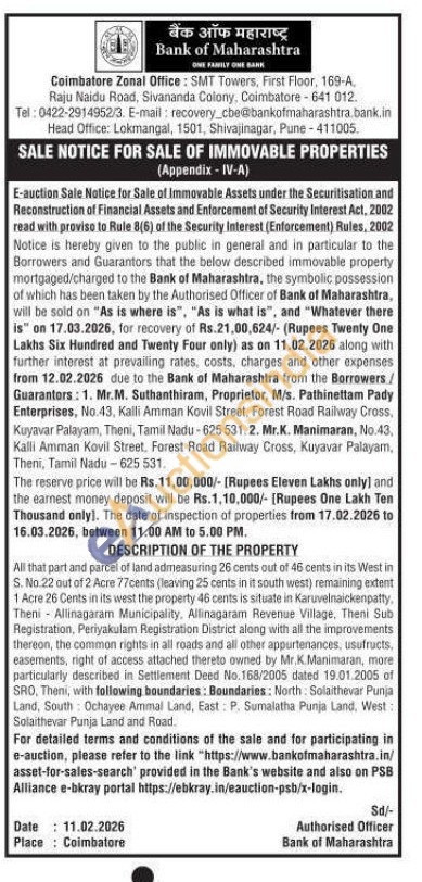 All that part and parcel of land admeasuring 26 cents out of 46 cents in its West in S. No.22 out of 2 Acre 77cents (leaving 25 cents in it south west) remaining extent 1 Acre 26 Cents in its west the property 46 cents is situate in Karuvelnaickenpatty. Theni Allinagaram Municipality, Allinagaram Revenue Village, Theni Sub Registration, Periyakulam Registration District along with all the improvements thereon, the common rights in all roads and all other appurtenances, usufructs, easements, right of access attached thereto owned by Mr.K.Manimaran, more particularly described in Settlement Deed No.168/2005 dated 19.01.2005 of SRO, Theni, with following boundaries: Boundaries: North Solaithevar Punja Land, South Ochayee Ammal Land, East: P. Sumalatha Punja Land. West: Solaithevar Punja Land and Road.
