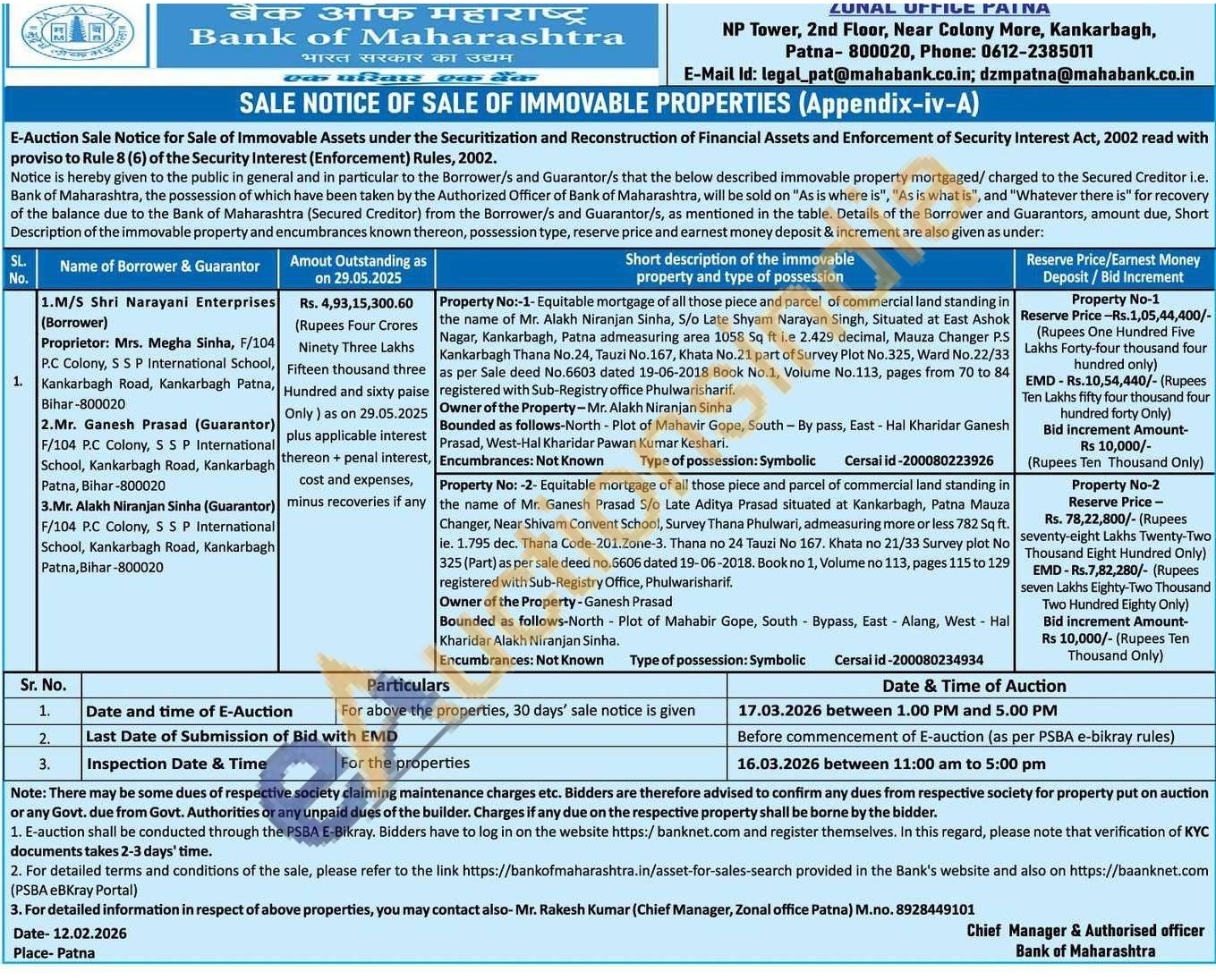 Property No:-1-Equitable mortgage of all those piece and parcel of commercial land standing in the name of Mr. Alakh Niranjan Sinha, S/o Late Shyam Narayan Singh, Situated at East Ashok Nagar, Kankarbagh, Patna admeasuring area 1058 Sq ft i.e 2.429 decimal, Mauza Changer P.S Kankarbagh Thana No.24, Tauzi No. 167, Khata No. 21 part of Survey Plot No.325, Ward No.22/33 as per Sale deed No.6603 dated 19-06-2018 Book No.1, Volume No.113, pages from 70 to 84 registered with Sub-Registry office Phulwarisharif.Owner of the Property-Mr. Alakh Niranjan Sinha Bounded as follows-North - Plot of Mahavir Gope, South By pass, East - Hal Kharidar Ganesh Prasad, West-Hal Kharidar Pawan Kumar Keshari.. Encumbrances: Not Known Type of possession: Symbolic
