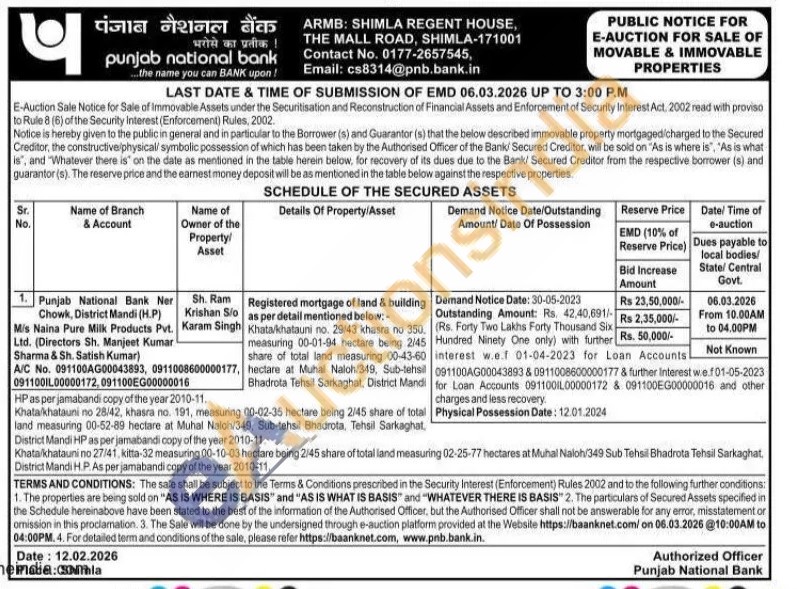 Registered mortgage of land & building as per detail mentioned below:- Khata/kkhatauni no. 29/43 khasra no 350. measuring 00-01-94 hectare being 2/45 share of total land measuring 00-43-60 hectare at Muhal Naloh/349, Sub-tehsil Bhadrota Tehsil Sarkaghat, District Mandi HP as per jamabandi copy of the year 2010-11. Khata/khatauni no 28/42, khasra no. 191, measuring 00-02-35 hectare being 2/45 share of total land measuring 00-52-89 hectare at Muhal Naloh/349, Sub-tehsil Bhadrota, Tehsil Sarkaghat, District Mandi HP as per jamabandi copy of the year 2010-11 Khata/khatauni no 27/41, kitta-32 measuring 00-10-03 hectare being 2/45 share of total land measuring 02-25-77 hectares at Muhal Naloh/349 Sub Tehsil Bhadrota Tehsil Sarkaghat District Mandi H.P.As per jamabandi copy of the year 2010-11