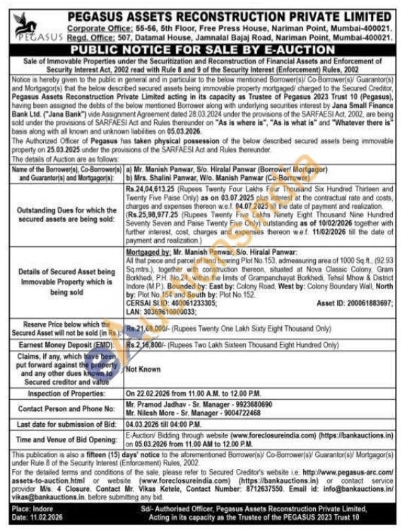 All that piece and parcel of land bearing Plot No. 153, admeasuring area of 1000 Sq.ft., (92.93 Sq.mirs.), together with construction thereon, situated at Nova Classic Colony, Gram Borkhedi, PH. No.24, within the limits of Grampanchayat Borkhedi, Tehsil Mhow & Distinct Indore (MP) Bounded by: East by: Colony Road, West by: Colony Boundary Wall, North by: Plot No. 154 and South by: Plot No. 152.