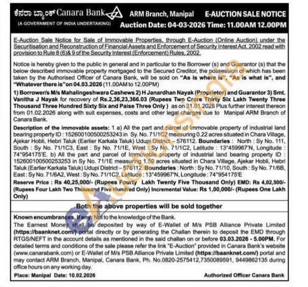 Description of the immovable assets: 1 a) All the part and parcel of Immovable property of industrial land bearing property ID: 152600100500253243 in Sy. No. 71/1C2 measuring 0.22 acres situated in Chara Village, Ajekar Hobli, Hebri Taluk (Earlier Karkala Taluk) Udupi District-576112. Boundaries: North: Sy No. 111, South: Sy No. 71/1C3, East: Sy No. 71/1E, West: Sy No. 71/1C2, Latitude: 13°459967°N, Longitude 74°954175E. b) All the part and parcel of Immovable property of industrial land bearing property ID: 152600100500253253 in Sy No. 71/1E measuring 1.59 acres situated in Chara Village, Ajekar Hobli, Hebri Taluk (Earlier Karkala Taluk) Udupi District-576112. Boundaries: North: Sy No. 71/10, South: Sy No. 71/68, East: Sy No. 71/6A2, West: Sy No. 71/1C2, Latitude: 13°459967'N, Longitude: 74 954175E