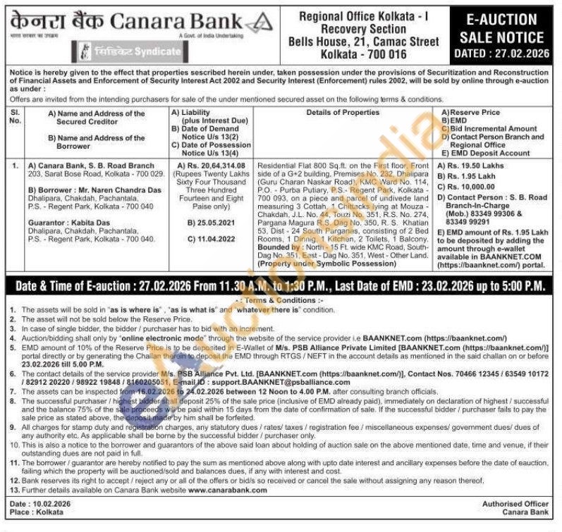 Residential Flat 800 Sq.ft. on the First floor, Front side of a G+2 building. Premises No. 232, Dhalipara (Guru Charan Naskar Road), KMC Ward No. 114, P.O. Purba Putiary, P.S- Regent Park, Kolkata 700 093, on a piece and parcel of undivede land measuring 3 Cottah, 1 Chittacks lying at Mouza -Chakdah, J.L. No. 44, Touzi No. 351, R.S. No. 274, Pargana Magura R.S. Dag No. 350. R. S. Khatian 53, Dist-24 South Parganas, consisting of 2 Bed Rooms, 1 Dinnig. 1 Kitchen, 2 Toilets, 1 Balcony, Bounded by: North-15 FL wide KMC Road, South Dag No. 351, East-Dag No. 351, West-Other Land. (Property under Symbolic Possession