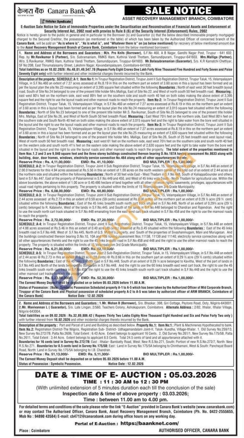 SCHEDULE: A-4: In Tirupur Registration District, Tirupur Joint II Sub Registration District, Tirupur Taluk, 15, Velampalayam Village, in S.F.No.448 an extent of 4.88 acres assessed at Rs.5.46 in this an extent of 0.40 acre (40 cents) assessed at Rs.0.45 situated within the following Boundaries: East of the 45 links breadth road in S.F.No.448, West of S.F.No.445, North of G.S. Mythili's property, and South of the properties of Sivashanmugam, Mani and Murugesan. And the buildings constructed thereon bearing D.No. 10, 10A and 108 having assessment Nos. 11138, 11139 and 11140, electricity service connection along with all other appurtenances thereto and the right to use the 45 links breadth road in S.F.No.458 and 448 and the right to use the other mamool roads to reach the property. The property is situated within the limits of 15 Velampalayam 3rd Grade Municipality.