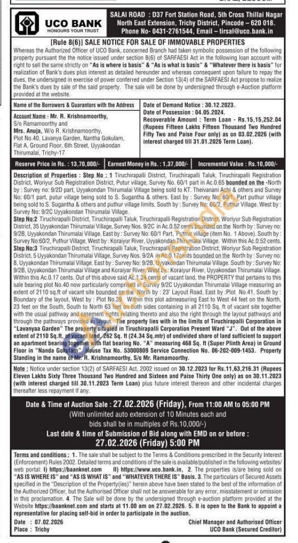 Description of Properties: Step No: 1 Tiruchirapalli District, Tiruchirapalli Taluk, Tiruchirapalli Registration District, Woriyur Sub Registration District, Putur village, Survey No. 60/1 part in Ac. 0.65 bounded on the -North by: Survey no: 9/2D part, Uyyakondan Thirumalai Village being sold to KT. Theivanani Achi & others and Survey No: 60/1 part, putur village being sold to S. Sugantha & others. East by: Survey No: 60/1, Part puthur village being sold to S. Sugantha & others and puthur village limits. South by: Survey No: 60/2, Puthur Village. West by Survey No: 9/2C Uyyakondan Thirunalai Village Step No:2 Tiruchirapalli District, Tiruchirapalli Taluk, Tiruchirapalli Registration District, Woriyur Sub Registration District, 35 Uyyakondan Thirumalai Village, Survey Nos. 9/2C in Ac.0.52 cents bounded on the North by: Survey nо 9/28, Uyyakondan Thirumalai Village. East by: Survey No: 60/1 Part. Puthur village (itern No. 1 Above). South by Survey No: 60/2, Puthur Village, West by: Koraiyur River. Uyyakondan Thirumalai Village. Within this Ac. 0.52 cents. Step No:3 Tiruchirapalli District, Tiruchirapalli Taluk, Tiruchirapalli Registration District, Woriyur Sub Registration District, 5 Uyyakondan Thirumalai Village, Survey Nos. 9/2A in Ac.0.17cents bounded on the North by: Survey no: 8. Uyyakondan Thirumalai Village. East by: Survey No: 9/2B, Uyyakondan Thirumalai Village. South by: Survey No 9/2B, Uyyakondan Thirumalai Village and Koraiyar River, West by: Koraiyur River, Uyyakondan Thirumalai Village. Within this Ac.0.17 cents. Out of this above said Ac. 1.34 cents of vacant land, the PROPERTY that pertains to this sale bearing plot No.40 now particularly comprised in Survey 9/20 Uyyakondan Thirumalai Village measuring an extent of 2110 sq.ft of vacant site bounded on the North by: 23' Layout Road, East by :Plot No.41, South by: Boundary of the layout, West by: Plot No.39. Within this plot admeasuring East to West 44 feet on the North 23 feet on the South, South to North 63 feet on both sides containing in all 2110 Sq. ft of vacant site together with the usual pathway and easement rights relating thereto and also the right through the layout pathways and through the pathways provided in layout.