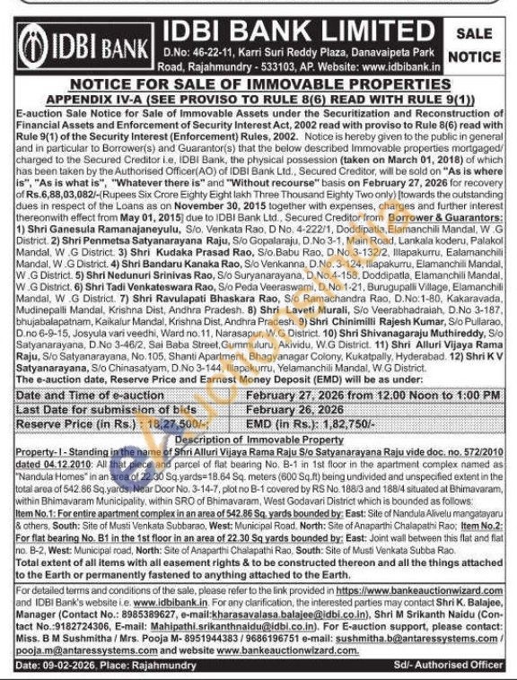 Property-1-Standing in the name of Shri Alluri Vijaya Rama Raju Sio Satyanarayana Raju vide doc. no. 572/2010 dated 04.12.2010: All that piece and parcel of flat bearing No. B-1 in 1st floor in the apartment complex named as "Nandula Homes" in an area of 22.30 Sq yards-18.64 Sq. meters (600 Sq.ft) being undivided and unspecified extent in the total area of 542.86 Sq.yards, Near Door No. 3-14-7, plot no B-1 covered by RS No. 188/3 and 188/4 situated at Bhimavaram, within Bhimavaram Municipality, within SRO of Bhimavaram, West Godavari District which is bounded as follows: Item No. 1: For entire apartment complex in an area of 542.86 Sq, yards bounded by: East: Site of Nandula Alivelu mangatayaru & others, South: Site of Musti Venkata Subbarao, West: Municipal Road. North: Site of Anaparthi Chalapathi Rao; Item No.2: For flat bearing No. B1 in the 1st floor in an area of 22.30 Sq yards bounded by: East: Joint wall between this flat and flat no. 8-2, West: Municipal road, North: Site of Anaparthi Chalapathi Rao, South: Site of Musti Venkata Subba Rao Total extent of all items with all easement rights & to be constructed thereon and all the things attached to the Earth or permanently fastened to anything attached to the Earth
