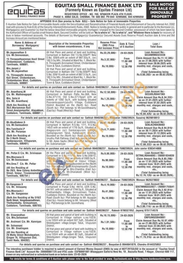 6) All that piece and parcel of land with building in Comprised in Village natham s no:102/8 sino: 103/4 with an exdent 507 Sqft., Situated at Meindayalam village, Singee Taluk, Vilupuram District All that piece and parcel of land with building in Comprised in Village natham s no:102/8. s.no:103/4 with an extent 82 Sqft, Situated at Meledayalam village. Gingee Taluk, Viluporam District