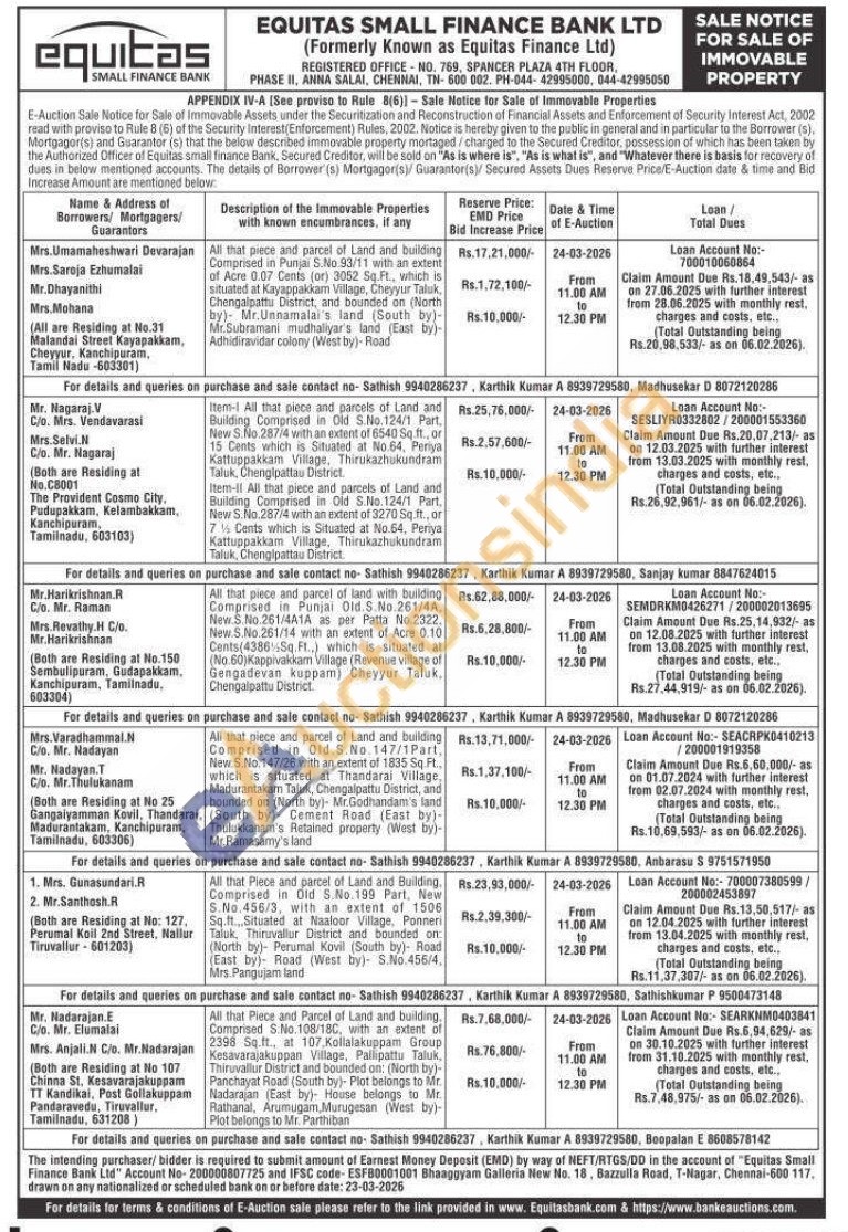 7) All that Piece and Parcel of Land and building. Comprised S.No.108/18C, with an extent of 2398 Sq.ft, at 107, Kollalakuppam Group Kesavarajakuppan Village, Pallipattu Taluk, Thiruvallur District and bounded on: (North by)-Panchayat Road (South by)- Plot belongs to Mr. Nadarajan (East by) House belongs to Mr. Rathanal, Arumugam, Murugesan (West by)-Plot belongs to Mr. Parthiban