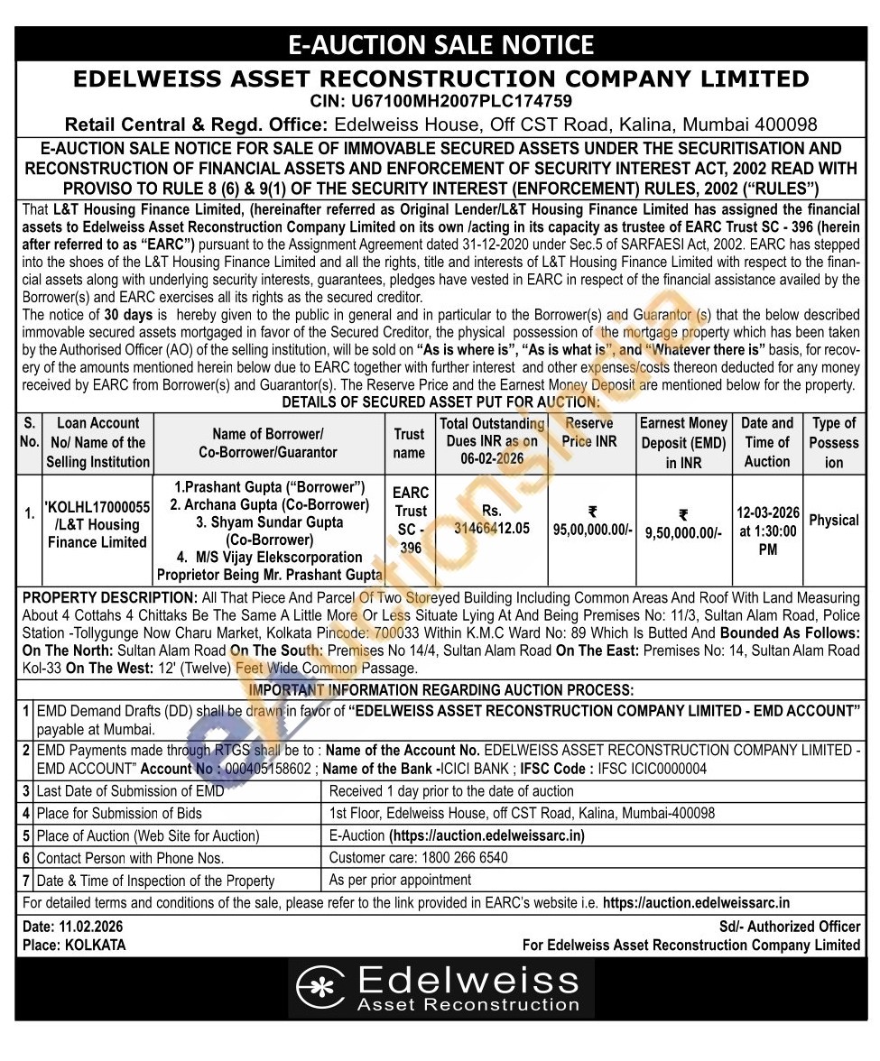 PROPERTY DESCRIPTION: All That Piece And Parcel Of Two Storeyed Building Including Common Areas And Roof With Land Measuring About 4 Cottahs 4 Chittaks Be The Same A Little More Or Less Situate Lying At And Being Premises No: 11/3, Sultan Alam Road, Police Station-Tollygunge Now Charu Market, Kolkata Pincode: 700033 Within K.M.C Ward No: 89 Which Is Butted And Bounded As Follows: On The North: Sultan Alam Road On The South: Premises No 14/4, Sultan Alam Road On The East: Premises No: 14, Sultan Alam Road Kol-33 On The West: 12' (Twelve) Feet Wide Common Passage