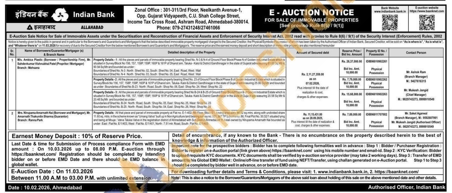 Property Details -1: All the pieces and parcels of immovable property bearing Shed No. N-3 & N-4 of Ground Floor Block/Phase N of Golden Industrial Estate which is situated in Survey/Block No 156, 157, 158P. 159P, 160P & 161P of Dhanot sim, Taluka Kalol & District Gandhinagar in the state of Gujarat admeasuring 81.03 Sq Mtr & 90.94 Sq Mtr and bounded as under: Boundaries of Shed No. N-3: North: Shed No. 02, South: Shed No. 04, East: Road, West: Wall Boundaries of Shed No. N-4: North: Shed No. 03, South: Shed No. 05. East: Road, West: Wall