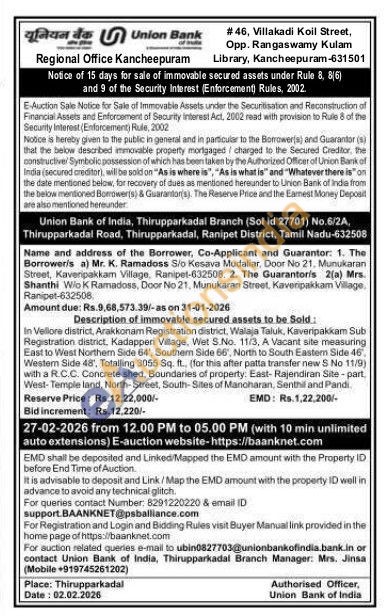 In Vellore district, Arakkonam Registration district, Walaja Taluk, Kaveripakkam Sub Registration district, Kadapperi Village, Wet S.No. 11/3, A Vacant site measuring East to West Northern Side 64', Southem Side 66, North to South Eastem Side 46 Westem Side 48', Totalling 3055 Sq. ft. (for this after patta transfer new S No 11/9) with a R.C.C. Concrete shed, Boundaries of property: East-Rajendiran Site-part West-Temple land, North-Street, South-Sites of Mancharan, Senthil and Pandi