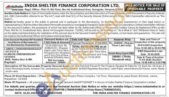 Description Of The Immovable Property/Secured Asset: All That Part And Parcel Of The Property Situated At Patta No 19, Book No. 08 Gram & Gram Panchayat Kodia Jodwara The. Jaswantpura Jalore Rajasthan 343029 Rajasthan Boundary:-:east Rasta, west-kishore Giri House, north- Rasta south-rasta