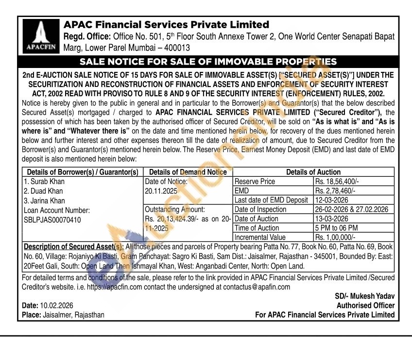 All those pieces and parcels of Property bearing Patta No. 77, Book No. 60, Patta No. 69, Book No. 60, Village: Rojaniyo Ki Basti, Gram Panchayat: Sagro Ki Basti, Sam Dist.: Jaisalmer, Rajasthan - 345001, Bounded By: East: 20Feet Gali, South: Open Land Then Ishmayal Khan, West: Anganbadi Center, North: Open Land.