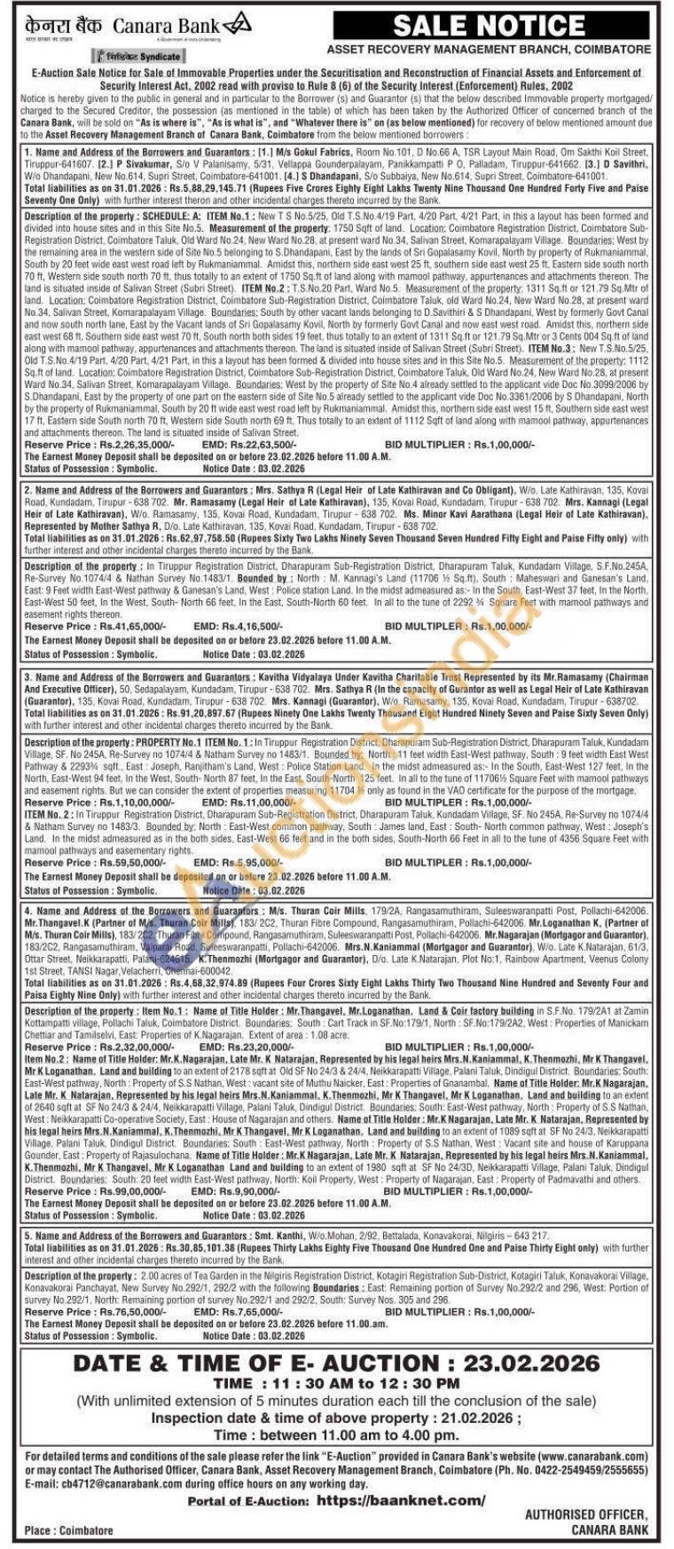 Land and building to an extent of 2640 sqft at SF No 24/3 & 24/4, Neikkarapatti Village, Palani Taluk, Dindigul District. Boundaries: South: East-West pathway, North Property of S.S Nathan, West: Neikkarapatti Co-operative Society, East: House of Nagarajan and others. Name of Title Holder: Mr. K Nagarajan, Late Mr. K. Natarajan, Represented by his legal heirs Mrs.N.Kaniammal, K. Thenmozhi, Mr. K Thangavel, Mr. K Loganathan. Land and building to an extent of 1089 sqft at SF No 24/3, Neikkarapatti Village, Palani Taluk, Dindigul District. Boundaries: South East-West pathway, North: Property of S.S Nathan, West: Vacant site and house of Karuppana Gounder, East: Property of Rajasulochana. Name of Title Holder: Mr.K Nagarajan, Late Mr. K Natarajan, Represented by his legal heirs Mrs.N. Kaniammal. K. Thenmozhi, Mr. K Thangavel. Mr. K Loganathan Land and building to an extent of 1980 sqft at SF No 24/3D, Neikkarapatti Village, Palani Taluk, Dindigul District. Boundaries: South: 20 feet width East-West pathway, North: Koil Property, West: Property of Nagarajan, East: Property of Padmavathi and others