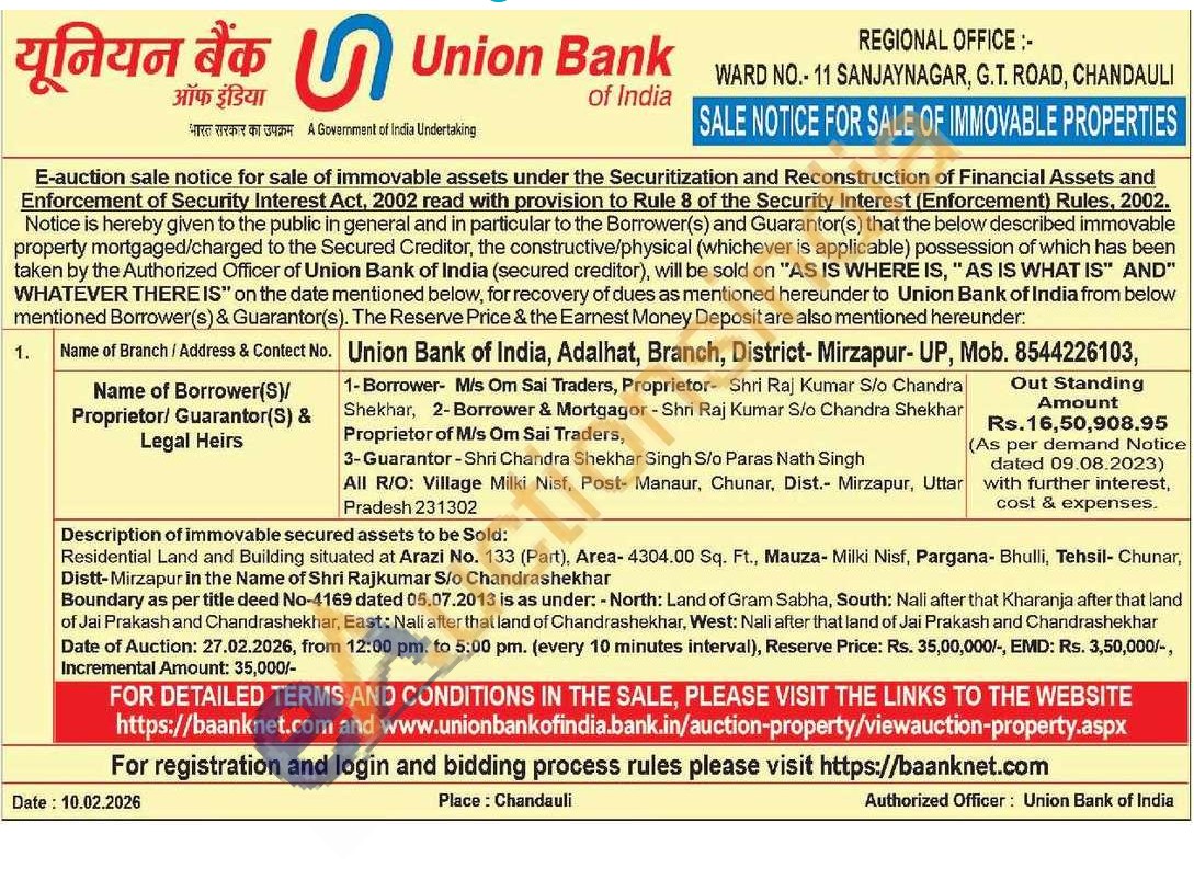 Description of immovable secured assets to be Sold: Residential Land and Building situated at Arazi No. 133 (Part), Area-4304.00 Sq. Ft., Mauza- Milki Nisf, Pargana-Bhulli, Tehsil- Chunar, Distt-Mirzapur in the Name of Shri Rajkumar S/o Chandrashekhar