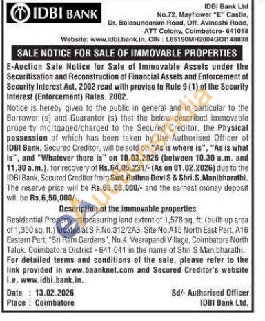Residential Property admeasuring land extent of 1,578 sq. ft. (built-up area of 1,350 sq. ft.) located at S.F.No.312/2A3, Site No.A15 North East Part, A16 Eastern Part. "Sri Ram Gardens", No.4, Veerapandi Village, Coimbatore North Taluk, Coimbatore District-641 041 in the name of Shri S Manibharathi