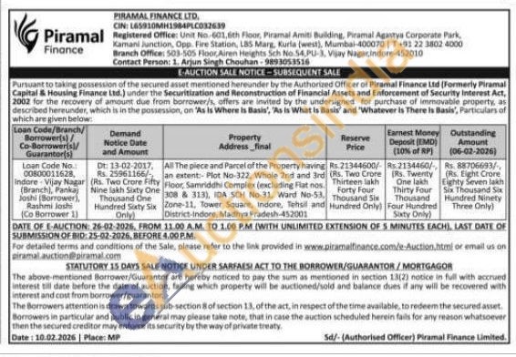 All The piece and Parcel of the Property having an extent:-Plot No-322, Whole 2nd and 3rd Floor, Samriddhi Complex (excluding Flat nos 308 & 313), IDA SCH No-31, Ward No-53. Zone-11, Tower Square, Indore, Tehsil and District-Indore, Madhya Pradesh-452001