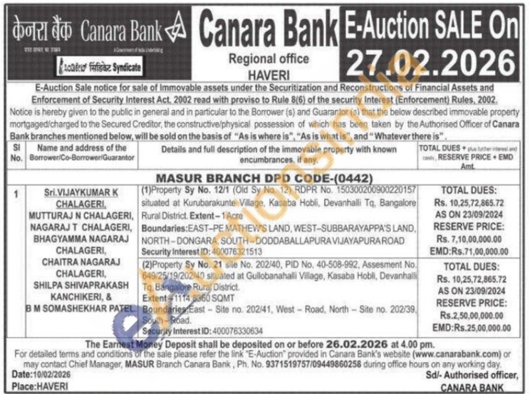 Property Sy No. 12/1 (Old Sy No. 12) RDPR No. 150300200900220157 situated at Kurubarakunte Village, Kasaba Hobli, Devanhalli To, Bangalore Rural District. Extent-1Acre Boundaries: EAST-PE MATHEW'S LAND, WEST-SUBBARAYAPPA'SI LAND. NORTH-DONGARA, SOUTH-DODDABALLAPURA VIJAYAPURA ROAD Security Interest ID: 400076321513