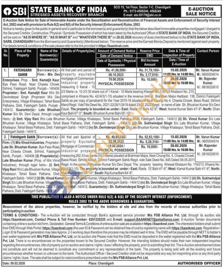 All that part and parcel of Dev property equitable Caur mortgage of Commercial owk Industrial property 406 measuring 0 Kanal 10 2/3 Maria ie. 10 2/3 30 share out of 1 Kanal-10 Marla bearing Khewat No. 119/119 Khatauni No. 215. Dey comprised in Khasra No. 42//4/3(1-10) situated in the revenue limit of Brahman Majra Hadbast. 138, District Fatehgarh Bassi Sahib as per copy of jamabandi for the Year 2015-16 situated at Near Chungi No 4. Chawla Chowk, Bassi Road, Sirhind ab Mand Regd. Vide Title Deed No. 2021-22/26/1/2419 dated 23.02.2022 Regd. in name of late Sh. Bhushan Kumar Sio Devi han Dayal. The property is bounded as under:- East: Rasta 15' Bahi 42"-9", West: Kamal Kumar Bahi 41'-9"; North: Dhan egal Kaur Bahi 67-0", South: Bhushan Kumar Bahi 65'-10".