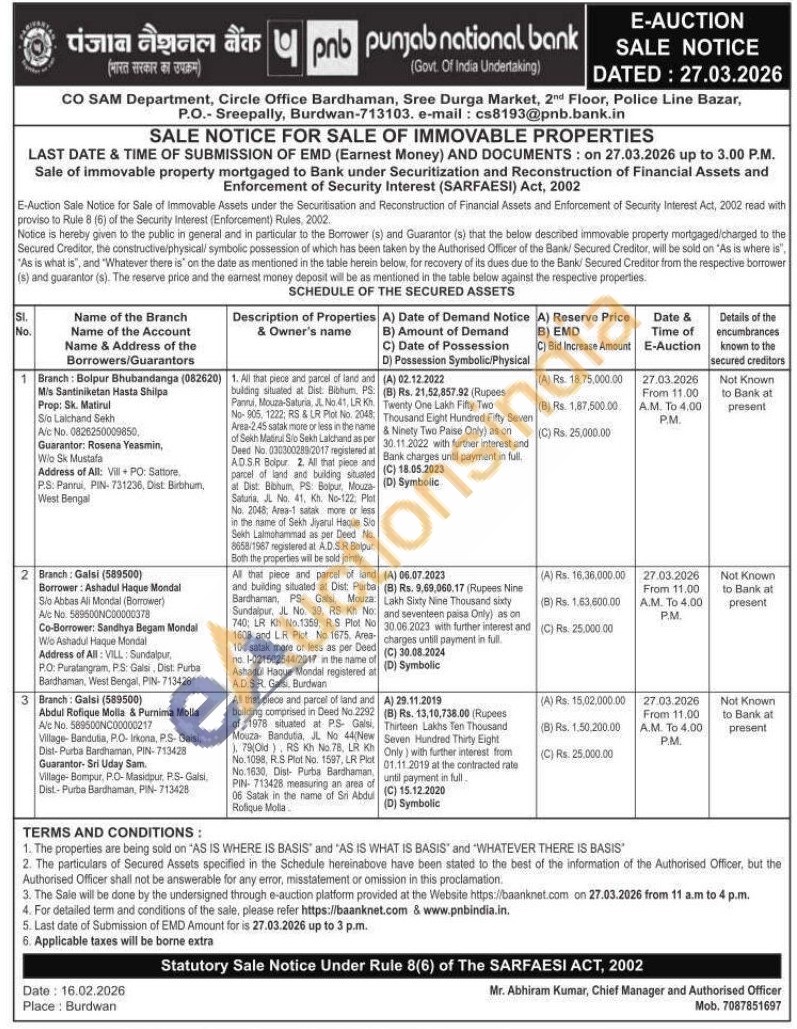 1. All that piece and parcel of land and building situated at Dist. Bibhum, PS: Panni, Mouta-Saturia & No. 41, LR Kh. No-905, 1222, RS & LR Plot No. 2048: Area-2.45 satak more or less in the name of Sekh Matirul Sio Sakh Lalchand as per Deed No. 030300288-2017 registered at ADSR Bolpur 2. All that piece and parcel of land and building situated at Dist: Birbhum , PS Bolpur, Mouza Saturia No. 41. K. No-122 Plet No. 2048, Area-1 satak more or less in the name of Sekh Jiyarul Haque Sto Sekh Lalmohammad as per Deed No. 8658/1987 registered at ADSR Bolpur Both the properties will be sold jointly