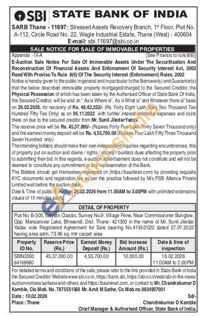 Flat No. B-305, Gayatri Classic, Survey No.9, Village Fene, Near Commissioner Bunglow, Opp. Mansarovar Lake, Bhiwandi, Dist. Thane-421302 in the name of Mr. Sunil Jiledar Yadav vide Registered Agreement for Sale bearing No.4134/2022 dated 27.07.2022 having area adm. 73.96 sq. mtr carpet area