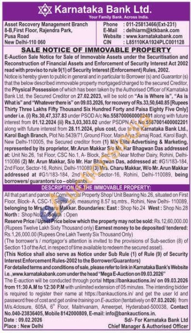 All that part and parcel of Commercial Property Shop/ Unit Bearing No. 26, situated on First Floor, Block-A, CSC-1, Sector-16, measuring 8.57 sq.mtrs., Rohini, New Delhi-110089, belonging to Mrs. Charu Makkar. Boundaries: East: Shop No.24 West: Shop No.28 North: Shop No.27 South: Open