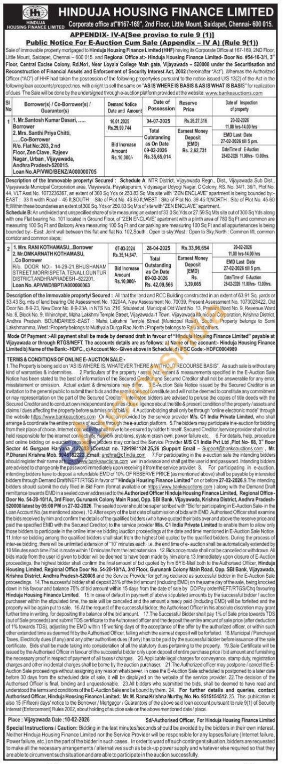 Description of the Immovable property/Secured: All that the land and RCC Building constructed in an extent of 63.91 Sq. yards or 53.43 Sq. mts of land bearing Old Assessment No. 10204A, New Assessment No. 70039, Present Assessment No. 1073028422, Old Door No. 8-9-23, New Door No. 8-9-23A, in NTS No. 216, Situated at Municipal Old Ward No. 13. Present Ward No. 9, Revenue Ward No. 8, Block No. 9, Whinchpet, Maha Lakshmi Temple Street, Vijayawada-1 Town, Vijayawada Municipal Corporation, Krishna District, Andhra Pradesh. BOUNDARIES:-EAST: Maha Lakshmi Temple Street (Municipal Road), South Property belongs to Somi Lakshmamma, West: Property belongs to Muthyala Durga Rao, North: Property belongs to Raju and others