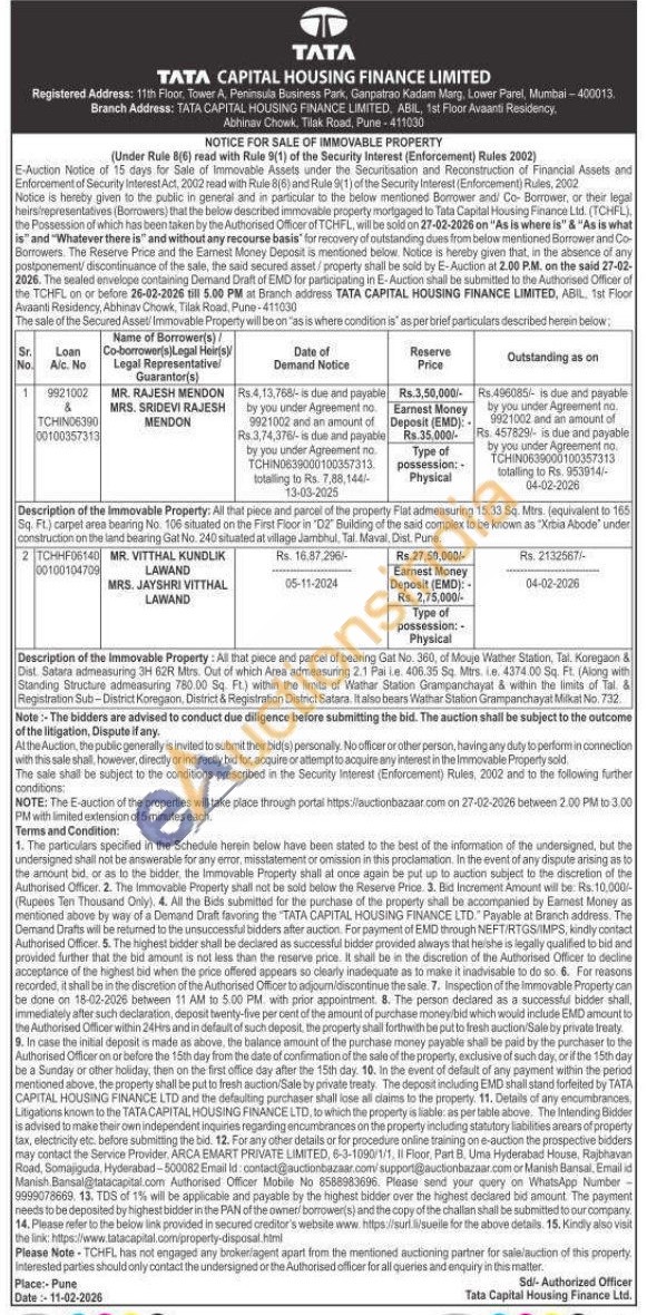 Description of the Immovable Property: All that piece and parcel of bearing Gat No. 360, of Mouje Wather Station, Tal. Koregaon & Dist. Satara admeasuring 3H 62R Mtrs. Out of which Area admeasuring 2.1 Pai ie. 406.35 Sq. Mtrs. i.e. 4374.00 Sq. Ft. (Along with Standing Structure admeasuring 780.00 Sq. Ft.) within the limits of Wathar Station Grampanchayat & within the limits of Tal. & Registration Sub-District Koregaon, District & Registration District Satara. It also bears Wathar Station Grampanchayat Milkat No. 732.