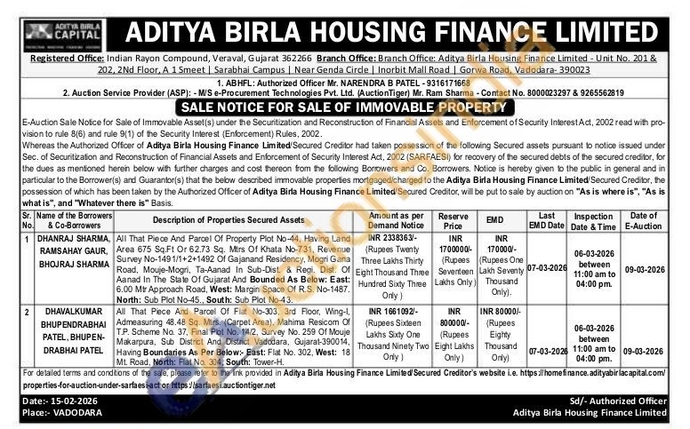 All That Piece And Parcel Of Property Plot No-44, Having Land Area 675 Sq.Ft Or 62.73 Sq. Mtrs Of Khata No-731, Revenue Survey No-1491/1+2+1492 Of Gajanand Residency, Mogri Gana Road, Mouje-Mogri, Ta-Aanad In Sub-Dist. & Regi. Dist. Of Aanad In The State Of Gujarat And Bounded As Below: East: 6.00 Mtr Approach Road, West: Margin Space Of R.S. No-1487. North: Sub Plot No-45., South: Sub Plot No-43